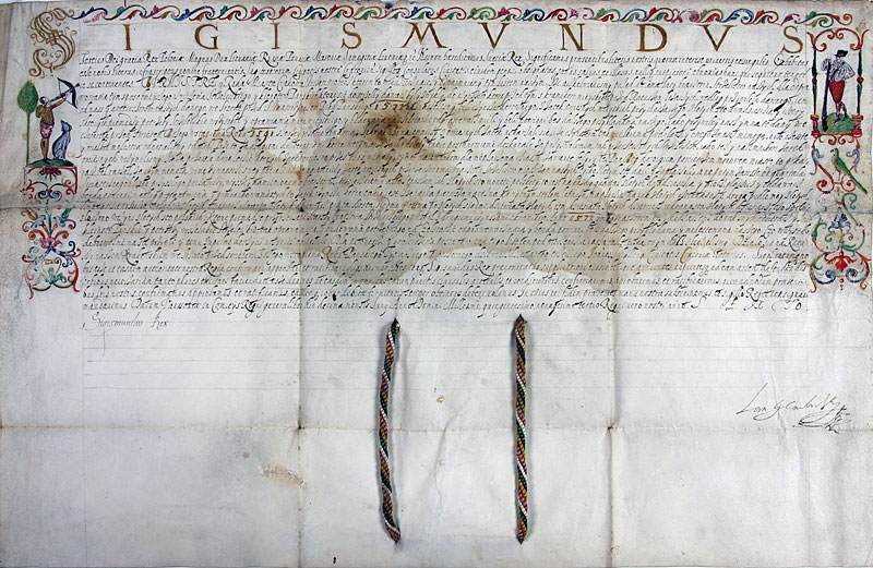 King Sigismund III Vasa (Zygmunt III Waza, 1566-1632) gives royal assent to the document presented by the mayor and city Council of Krakow from 1593 in favour of the Krakow Fowler Brotherhood (Marksmanship Association)